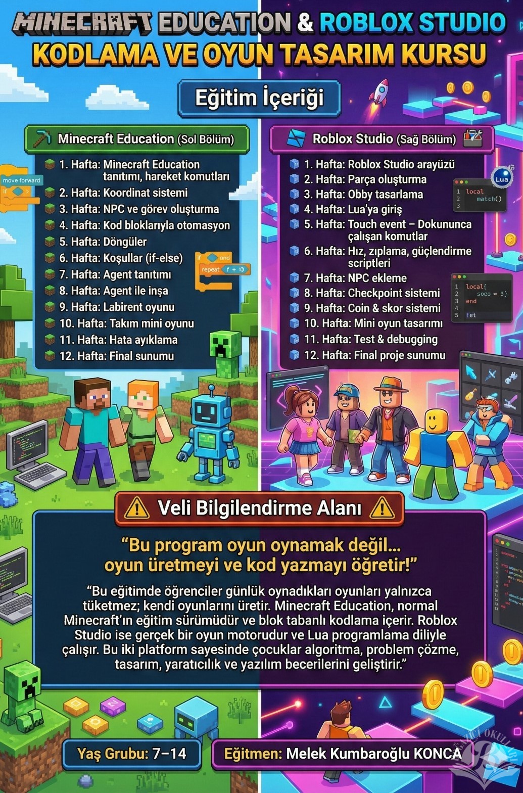 Bu eğitimde öğrenciler günlük oynadıkları oyunları yalnızca tüketmez; kendi oyunlarını üretir. Minecraft Education, normal Minecraft'ın eğitim sürümüdür ve blok tabanlı kodlama içerir. Roblox Studio ise gerçek bir oyun motorudur ve Lua programlama diliyle çalışır. Bu iki platform sayesinde çocuklar algoritma, problem çözme, tasarım, yaratıcılık ve yazılım becerilerini geliştirir.